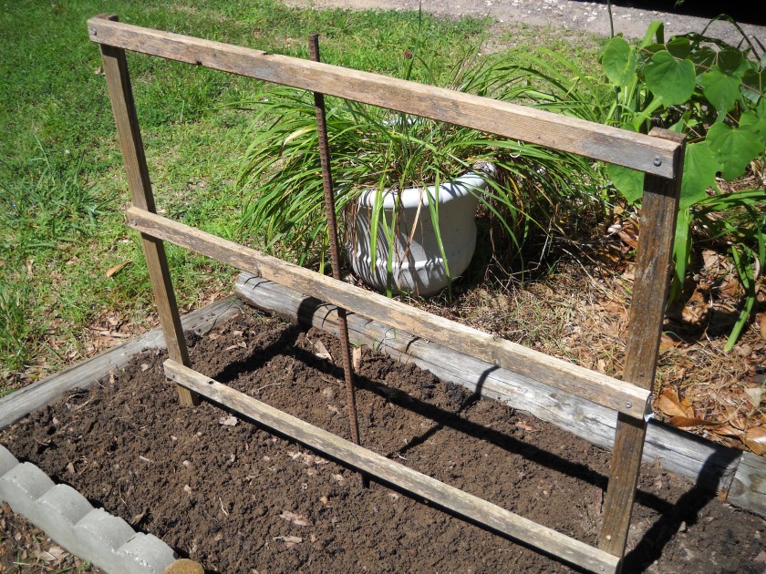 My next step was to enhance the soil with some left over potting soil, gather and install my supports. I used a trellis I made years ago out of furring strips. (furring strips are usually made from 1 by 2 rough cut pine).