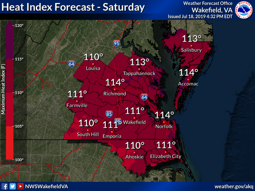 ...EXCESSIVE HEAT WARNING IN EFFECT FROM NOON SATURDAY TO 11 PM EDT SUNDAY... The National Weather Service in Wakefield has issued an Excessive Heat Warning, which is in effect from noon Saturday to 11 PM EDT Sunday. The Excessive Heat Watch is no longer in effect. * AREAS AFFECTED: Central Virginia and the Virginia northern neck...along with the Maryland and Virginia lower eastern shore. * HEAT INDEX VALUES: Around 105 late this afternoon, and 110 to 115 both Saturday and Sunday afternoons. * IMPACTS: Prolonged exposure or any strenuous activity may lead to heat related illnesses that require immediate medical attention. PRECAUTIONARY/PREPAREDNESS ACTIONS... Take extra precautions...if you work or spend time outside. When possible...reschedule strenuous activities to early morning or evening. Know the signs and symptoms of heat exhaustion and heat stroke. Wear light weight and loose fitting clothing when possible and drink plenty of water. To reduce risk during outdoor work...the occupational safety and health administration recommends scheduling frequent rest breaks in shaded or air conditioned environments. Anyone overcome by heat should be moved to a cool and shaded location. Heat stroke is an emergency...call 9 1 1. An Excessive Heat Warning means that a prolonged period of dangerously hot temperatures will occur. The combination of hot temperatures and high humidity will combine to create a DANGEROUS SITUATION in which heat illnesses are likely. Drink plenty of fluids...stay in an air-conditioned room...stay out of the sun... and check up on relatives and neighbors. Young children and pets should never be left unattended in vehicles under any circumstances. This is especially true during warm or hot weather when car interiors can reach lethal temperatures in a matter of minutes. A Heat Advisory means that a period of hot temperatures is expected. The combination of hot temperatures and high humidity will combine to create a situation in which heat illnesses are possible. Drink plenty of fluids...stay in an air-conditioned room...stay out of the sun...and check up on relatives and neighbors. Take extra precautions...if you work or spend time outside. When possible...reschedule strenuous activities to early morning or evening. Know the signs and symptoms of heat exhaustion and heat stroke. Wear light weight and loose fitting clothing when possible and drink plenty of water. To reduce risk during outdoor work...the occupational safety and health administration recommends scheduling frequent rest breaks in shaded or air conditioned environments. Anyone overcome by heat should be moved to a cool and shaded location. Heat stroke is an emergency...call 9 1 1.
