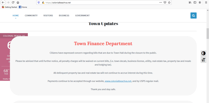 Please be advised that until further notice, all penalty charges will be waived on current bills, (i.e. town decals, business license, utility, real estate tax, property tax and meals and lodging tax).