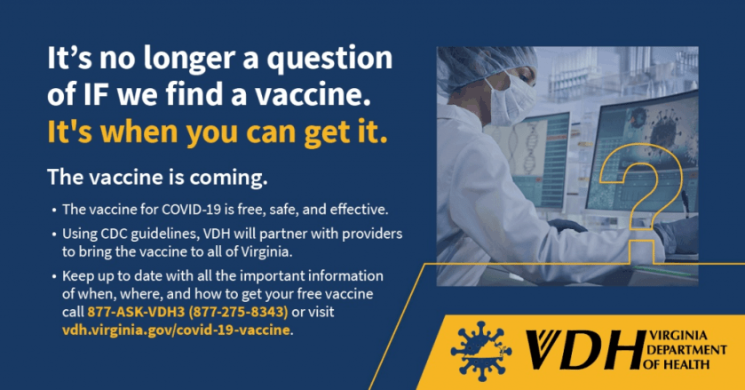 The Three Rivers Health District will begin vaccination of the very large population of persons eligible in phase 1b next week. If you qualify in phase 1b, and want a COVID 19 vaccination, or have any other COVID 19 vaccine related question, please call our COVID 19 resource center at 804-824-2733.