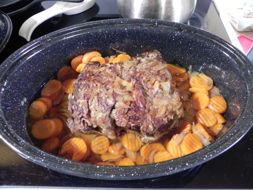 Place roast in a large baking pot with lid. If you don’t have a lid a sheet of tin foil will do nicely to cover it. Make sure you have enough to completely enclose the top without any venting.