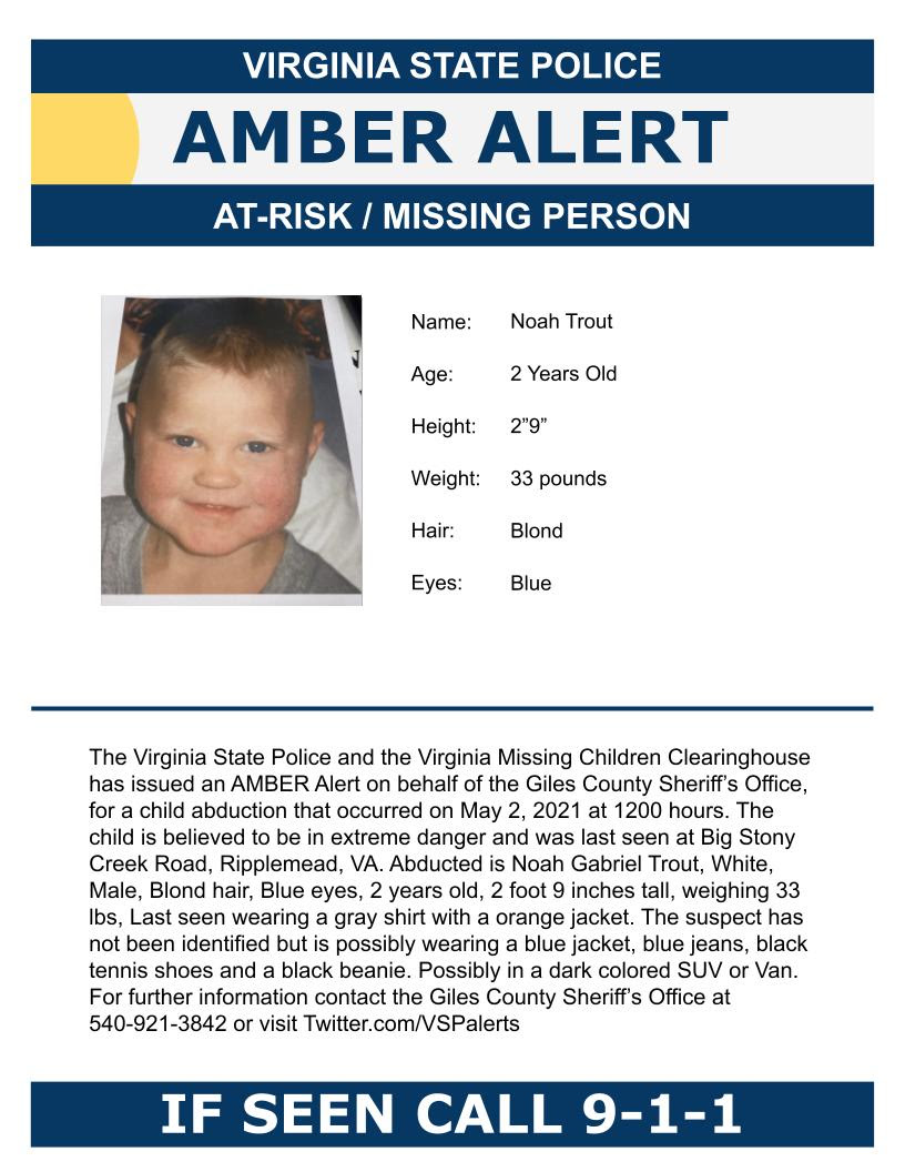 The Virginia State Police and the Virginia Missing Children Clearinghouse has issued an AMBER Alert on behalf of the Giles County Sheriff’s Office, for a child abduction that occurred on May 2, 2021 at 1200 hours.