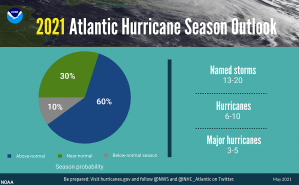 The article reads, “ May 20, 2021 – NOAA’s Climate Prediction Center is predicting another above-normal Atlantic hurricane season. Forecasters predict a 60% chance of an above-normal season, a 30% chance of a near-normal season, and a 10% chance of a below-normal season. However, experts do not anticipate the historic level of storm activity seen in 2020.”