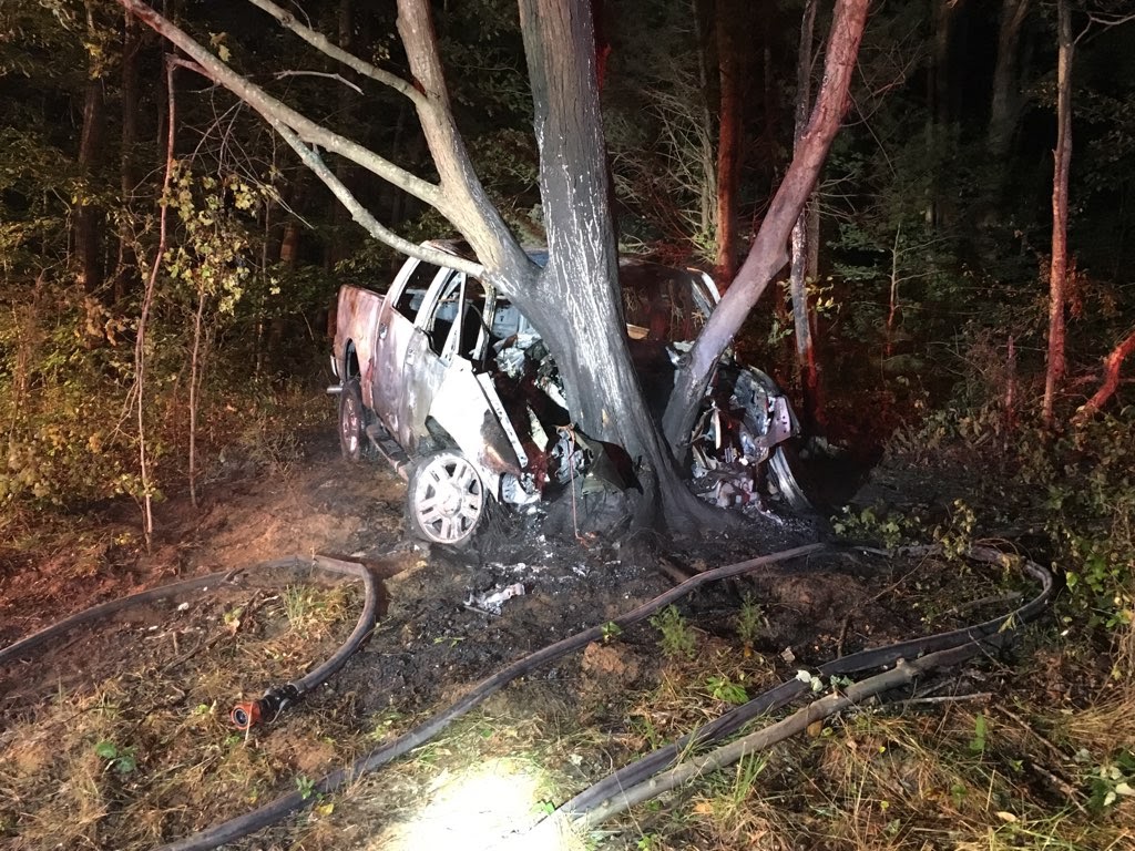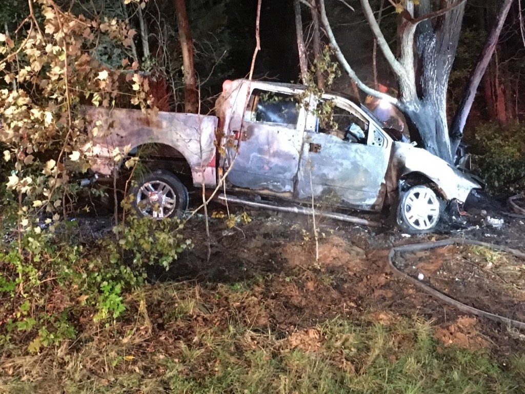 A 2008 Ford F150 headed west ran off the road to the left, struck a tree, and caught fire.