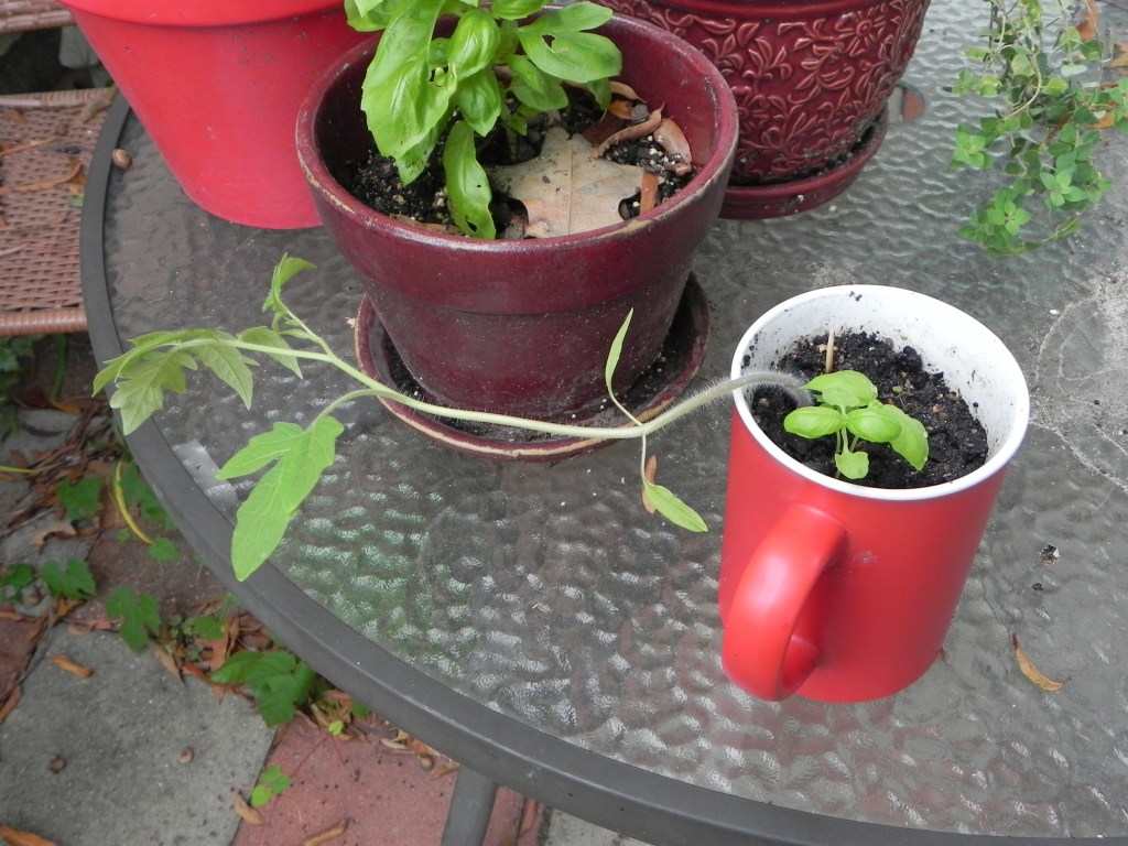 I brought out this set of seedlings. The Tomato seedling is really outgrowing the coffee cup and it’s time to transplant so the Basil doesn’t intertwine its roots with the tomato plant.