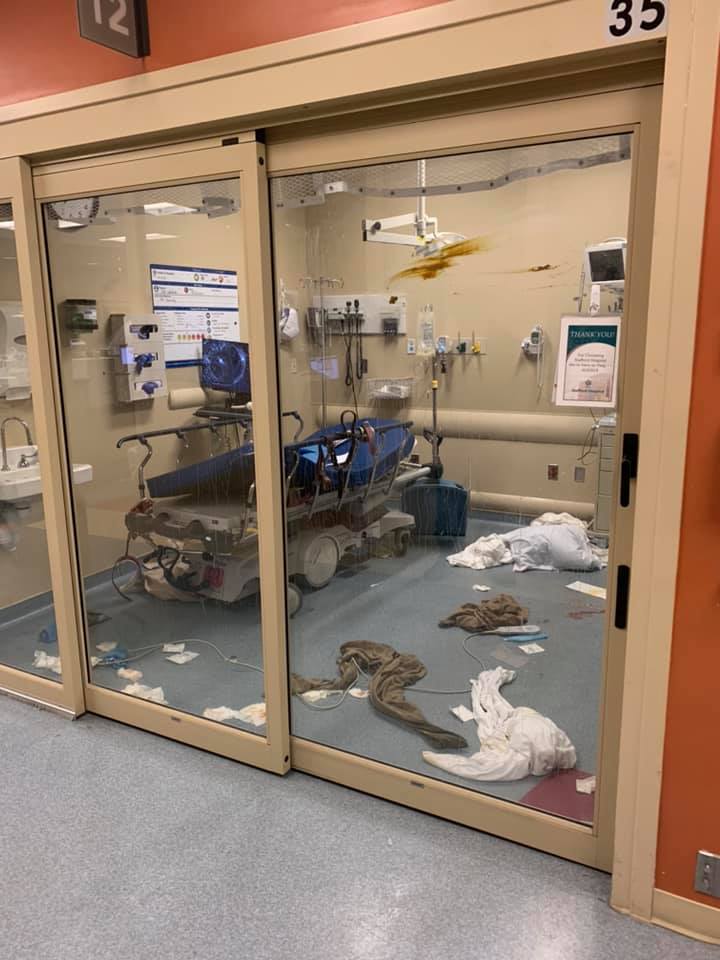 The ER room was in complete disarray, with the inmate restrained by one wrist and one leg to the hospital bed.