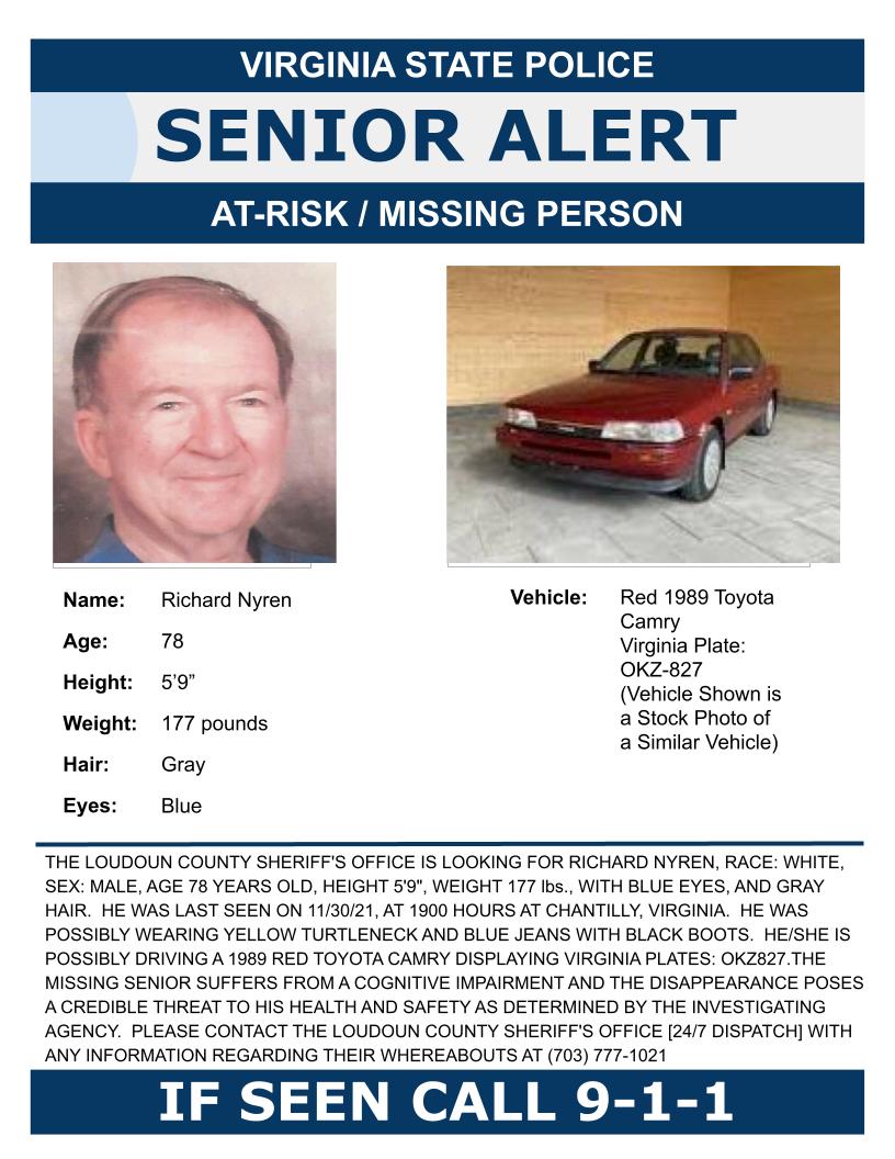 THE LOUDOUN COUNTY SHERIFF’S OFFICE IS LOOKING FOR RICHARD NYREN, RACE: WHITE, SEX: MALE, AGE 78 YEARS OLD, HEIGHT 5’9″, WEIGHT 177 lbs., WITH BLUE EYES, AND GRAY HAIR. HE WAS LAST SEEN ON 11/30/21, AT 1900 HOURS AT CHANTILLY, VIRGINIA. HE WAS POSSIBLY WEARING YELLOW TURTLENECK AND BLUE JEANS WITH BLACK BOOTS.