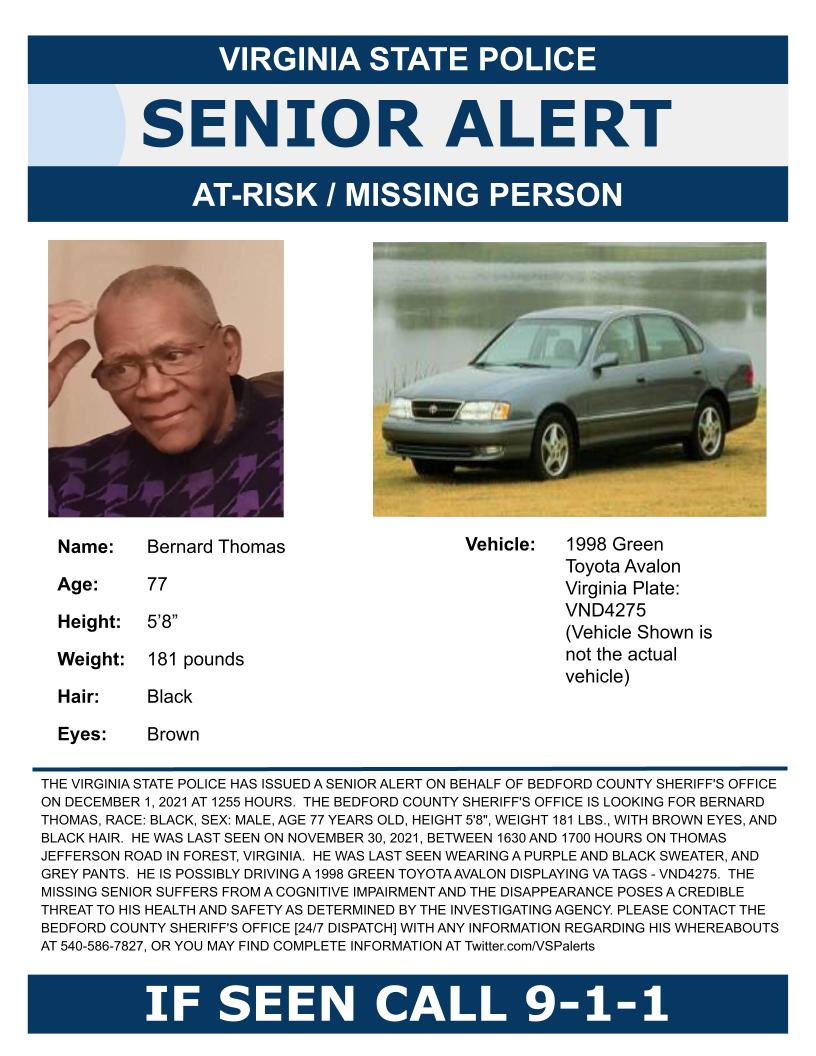 THE BEDFORD COUNTY SHERIFF’S OFFICE IS LOOKING FOR BERNARD THOMAS, RACE: BLACK SEX: MALE, AGE 77 YEARS OLD, HEIGHT 5’8″, WEIGHT 181 LBS., WITH BROWN EYES, AND BLACK HAIR. HE WAS LAST SEEN ON NOVEMBER 30, 2021, BETWEEN 1630 AND 1700 HOURS ON THOMAS JEFFERSON ROAD IN FOREST, VIRGINIA. HE WAS LAST SEEN WEARING A PURPLE AND BLACK SWEATER, AND GREY PANTS. HE IS DRIVING A 1998 GREEN TOYOTA AVALON DISPLAYING VA TAGS – VND 4275.