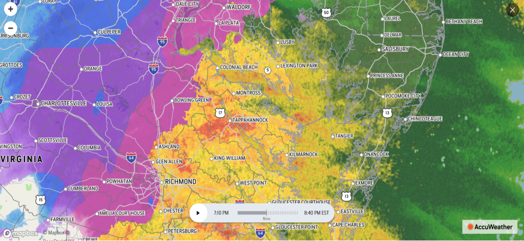In the Northern Neck and Middle Peninsula, primary roads are mostly in minor condition, with isolated areas of snow and slush coverage, except for King George County, where roads are in moderate condition, similar to the Fredericksburg area.