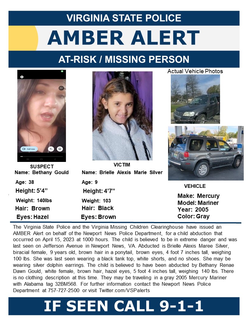 The Virginia State Police and the Virginia Missing Children Clearinghouse have issued an AMBER Alert on behalf of the Newport News Police Department, for a child abduction that occurred on April 15, 2023 at 1000 hours.
