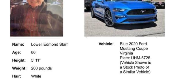 UPDATE: Cancelled, Mr Starr was located safely. THE STAFFORD COUNTY SHERIFF’S OFFICE IS LOOKING FOR LOWELL EDMOND STARR, RACE: WHITE, SEX: MALE, AGE 86 YEARS